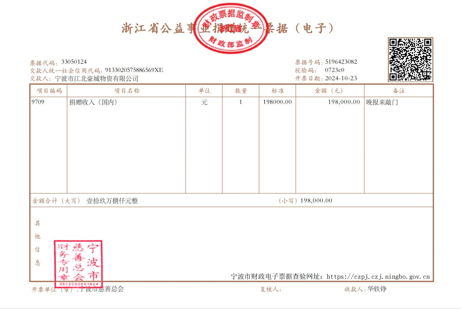 10月24日,宁波江北豪城码头向宁波市慈善总会捐助198000元,作为专项资金,关爱宁波的独居老人
